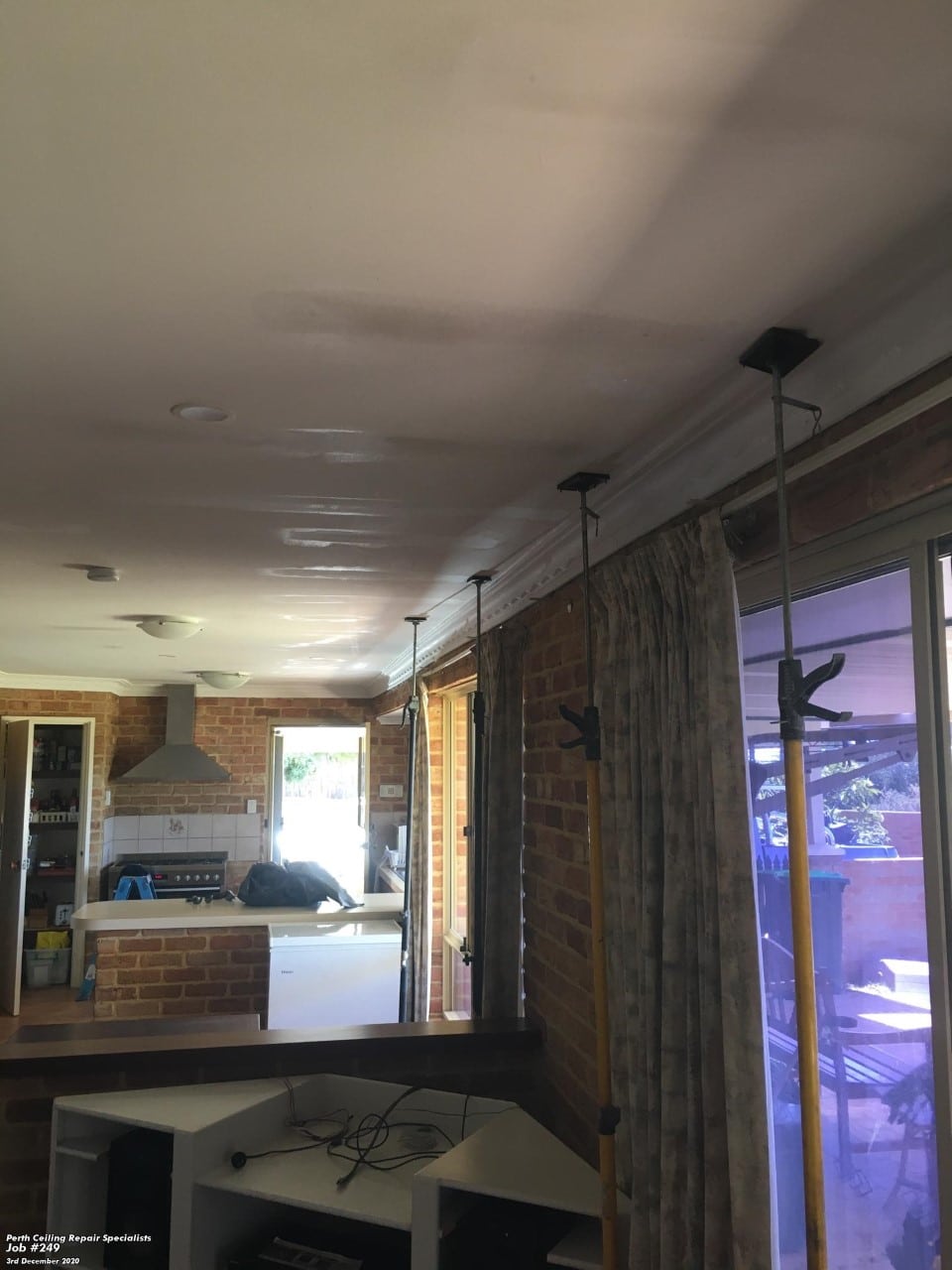 The ceiling was Gyprock with severe sagging and cracking through out the kitchen living area. The ceiling repair was done by propping, re screwing and fibre glass strapping being installed, the ceiling was then flushed ready for paint. our painters completed the job the following day by re painting the entire kitchen living area ceiling.