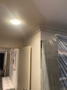 The ceiling surrounding the crack was secured. We taped the crack and applied 3 coats of plaster, as as tidying up an associated cornice mitre. The cracks was then back blocked to prevent future movement. Next our painter attended to paint the repaired ceiling.