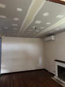 The existing ceiling was plaster glass and was severely sagging. This ceiling was pulled down and disposed of. We fitted new R4.0 insulation batts your the ceiling cavity and then a new steel ceiling grid was installed to the existing Jarrah joists. New Gyprock lining was fixed to the new grid with 90mm Cove cornice, this was flushed and sanded ready for paint.