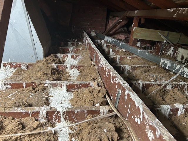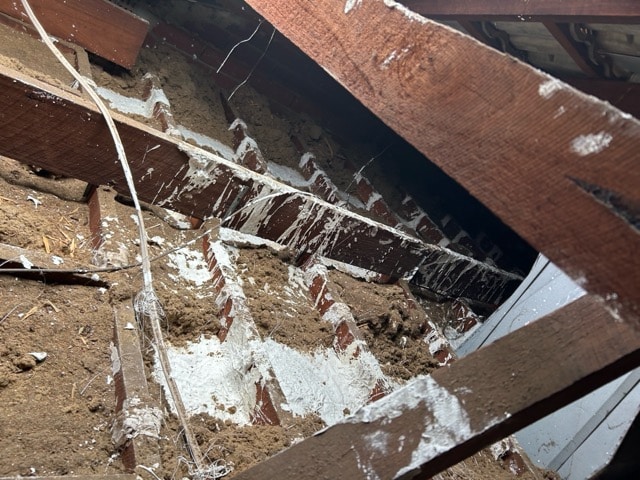 The ceiling was plaster glass and was sagging due to strapping failure related to age. The sagging ceiling was propped back up to the timber joists. New fibre glass strapping was installed from inside the ceiling cavity to lock the ceiling in place. The ceiling was then flushed and sanded ready for paint.